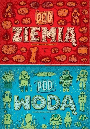 Nowy, dwustronny album Aleksandry i Daniela Mizielińskich. Po obrazkowej podróży po lądach, morzach i kulturach świata nadszedł czas na książkową wyprawę do wnętrza ziemi i w głębiny mórz i oceanów. Pod ziemią, pod wodą to naładowana informacjami księga pełna ogromnych ilustracji i szczegółowych przekrojów. Poprowadzą was one w głąb naszej planety, pokazując, co kryje się pod powierzchnią lądów i wód. Będziecie schodzić coraz głębiej i głębiej od cienkiej warstwy gleby tuż pod stopami do gorącego jądra Ziemi, od skąpanych w słońcu raf koralowych do pogrążonego w ciemności i chłodzie najgłębszego miejsca oceanów. Znajdziecie tam zwierzęta żyjące pod ziemią i dziwne głębinowe stworzenia, najgłębiej sięgające korzenie i plątaniny podziemnych rur, sensacyjne wykopaliska i skamieniałe kości dinozaurów. Zajrzycie do podziemnych nor i norek, zapuścicie się w labirynty jaskiń i zjedziecie na dno najgłębszej kopalni świata. Wypróbujecie zabytkowe okręty podwodne, zanurkujecie w podmorskiej studni i odwiedzicie wrak Titanica. Odkryjecie tajemnice podziemnego i podwodnego świata. Części Pod ziemią i Pod wodą zaczynają się po przeciwnych stronach książki, by spotkać się w środku, na rozkładówce poświęconej jądru Ziemi.