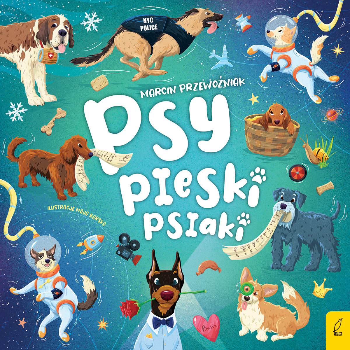 Psy, pieski, psiaki / Marcin Przewoźniak ; ilustracje Maja Barska. - Wydanie I. - Warszawa : Wilga, copyright 2021. - 54, [2] strony : ilustracje ; 26 cm.
