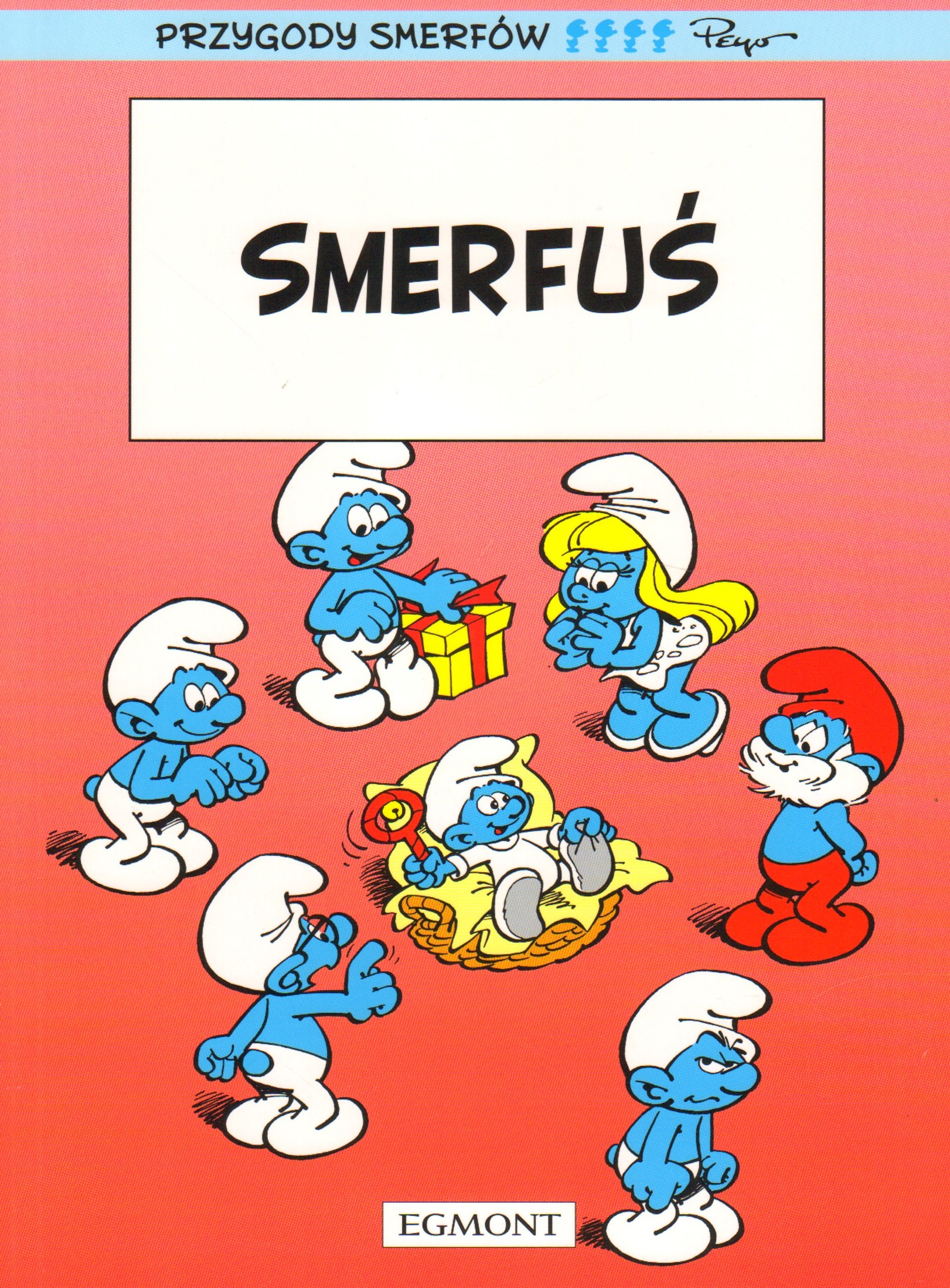 Komiks. W magiczną noc pełni niebieskiego księżyca do wioski Smerfów przylatuje bocian i zostawia tajemniczą przesyłkę. Okazuje się, że w koszyczku spoczywa nowo narodzone smerfie dziecko. Początkowo mieszkańcy wioski są przestraszeni odpowiedzialnością za malca, nie wiedzą też, jak się nim zajmować, ale szybko wszyscy, nawet Maruda, zakochują się w Smerfusiu. Dopiero prawdziwe niebezpieczeństwa i przeciwności losu uświadamiają Smerfom, jak ważny stał się dla nich niezapowiedziany mały gość.