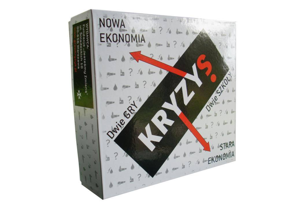 Kryzys. - Warszawa : Fundacja "Jestesmy Zmianą", [2018]. - 1 gra (1 plansza, klepsydra, 6 pionków, 2 kostki, 27 kart branż, 43 karty Nowa Ekonomia, 44 karty Stara Ekonomia, pionki czarne i czerwone, pieniądze w różnych nominałach) : karton, tektura, plastik, kolor ; w pudełku 27x25x8 cm + instrukcja (16 stron : ilustracje ; 22 cm).