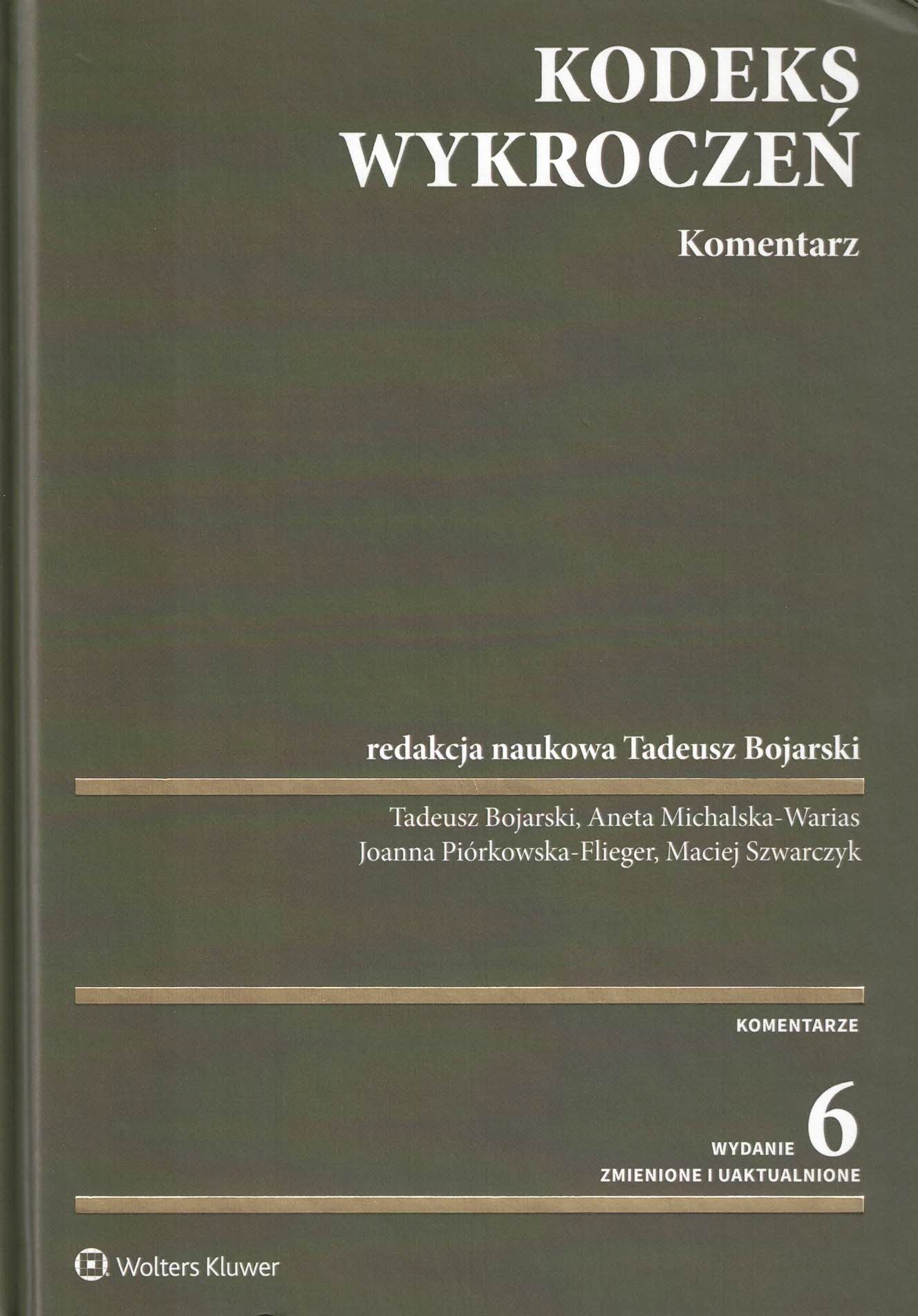 Kodeks wykroczeń : komentarz / redakcja naukowa Tadeusz Bojarski ; Tadeusz Bojarski, Aneta Michalska-Warias, Joanna Piórkowska-Flieger, Maciej Szwarczyk. - Wydanie 6 zmienione i uaktualnione. Stan prawny na 6 maja 2019 r. z uwzględnieniem ustawy z 24 listopada 2017 r. (Dz. U. z 2018 r., poz. 79) wchodzącej w życie 11 lipca 2019 r. - Warszawa : Wolters Kluwer, 2019. - 769, [1] strona ; 25 cm.