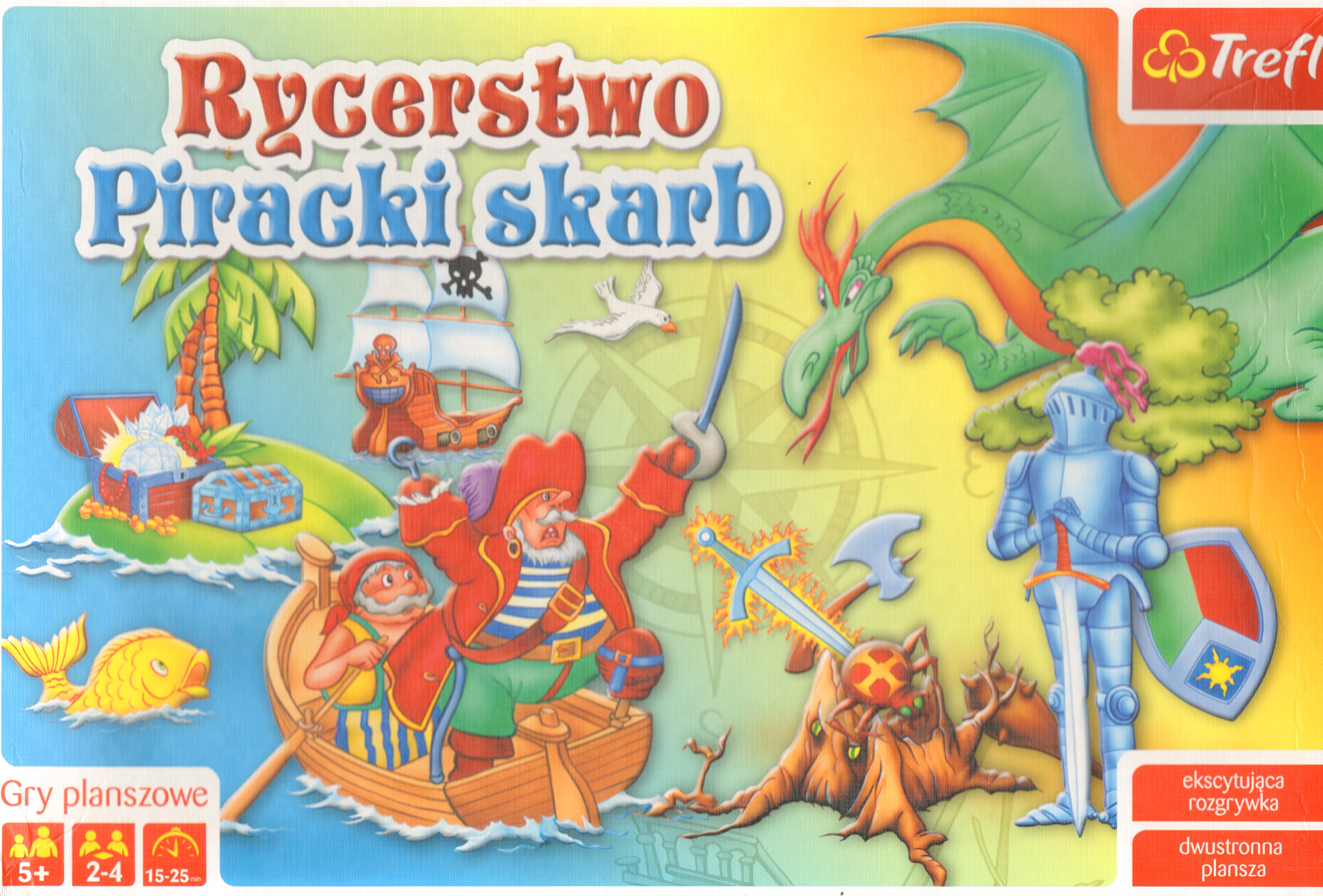 Rycerstwo ; Piracki skarb. - Gdynia : Trefl ; [2010]. - 1 gra (plansza do gry, 8 podstawek, 8 pionków. kostka do gry) : karton, tektura, plastik, kolor ; w pudełku 27x40x5 cm + instrukcja (2 strony : ilustracje ; 30 cm).