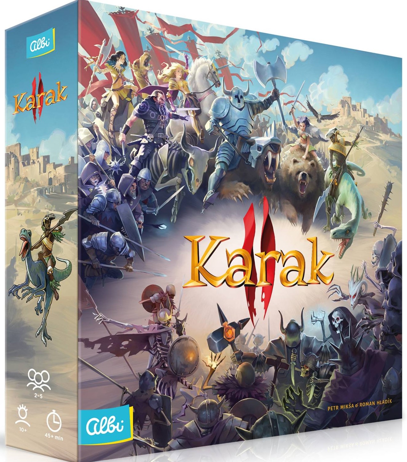 Karak. 2 / Petr Mikša, Roman Hladík. - Kraków : Albi Polska, © 2023. - 1 gra (1 płytka początkowa, 28 płytek krajobrazu, 6 pionków bohaterów, 6 żetonów miast, 6 kart bohaterów, 5 arkuszy bohaterów, 5 sztandarów, 6 kości bohaterów, 35 kości oddziałów, 30 żetów punktów wytrzymałości, 30 żetonów budynków, 40 znaczników żywności, 40 znaczników drewna, 40 znaczników kamienia, 1 woreczek, 36 żetonów armii potworów, 1 pionek Mrocznego Generała, 5 żetonówgwardzistów, 1 żeton zarazy) : karton, tektura, drewno, kolor ; w pudełku 31x31x8 cm + 3 instrukcje (15 stron : ilustracje ; 28 cm).