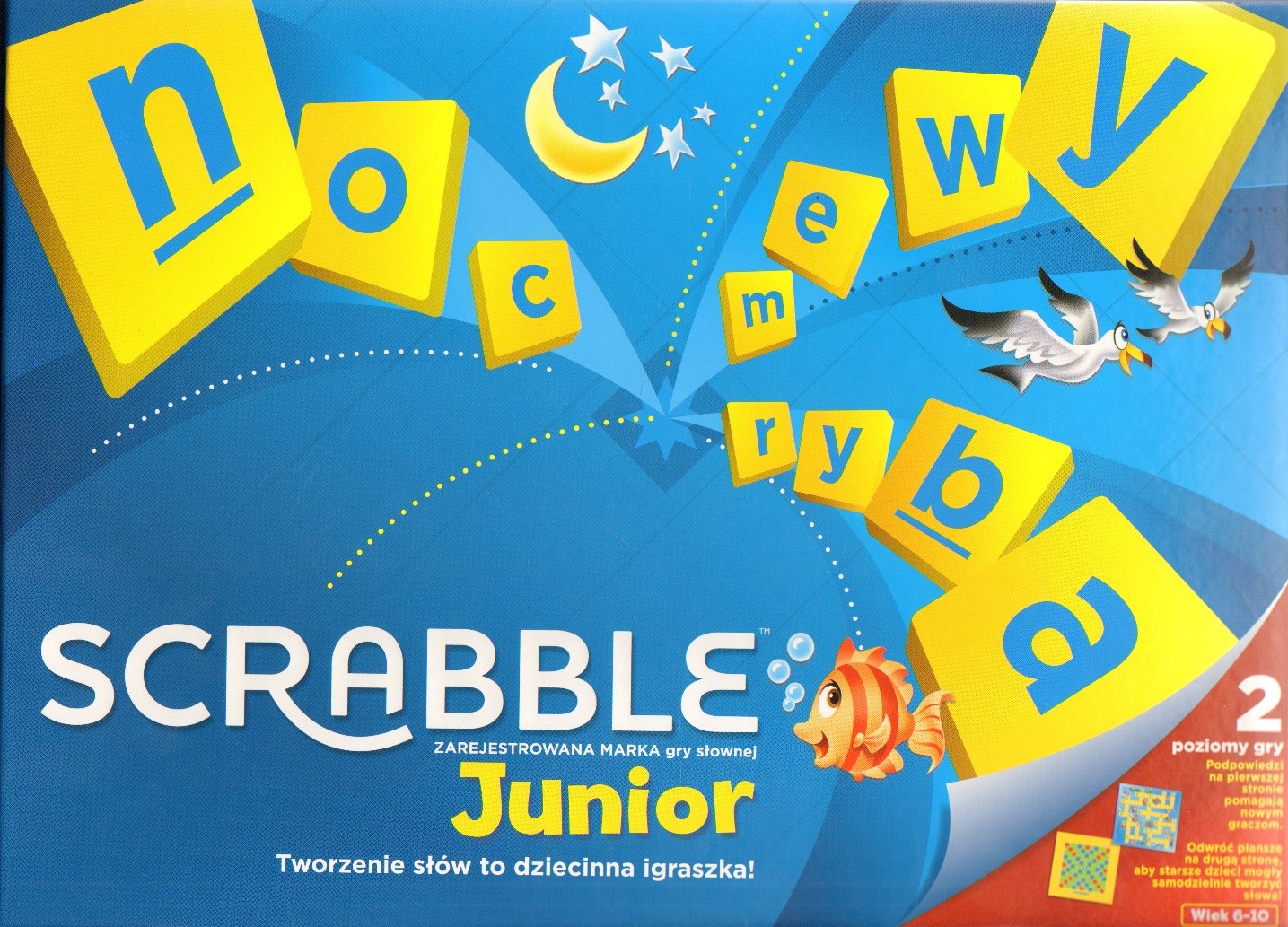 GRA PLANSZOWA. Dziecięca wersja popularnej gry, opracowana w dwóch wersjach - dla dzieci młodszych oraz starszych. Pierwsza wersja ułatwia dzieciom naukę czytania i bezbłędnego pisania. Wersja dla starszych dzieci pozwala na samodzielne wymyślanie słów.