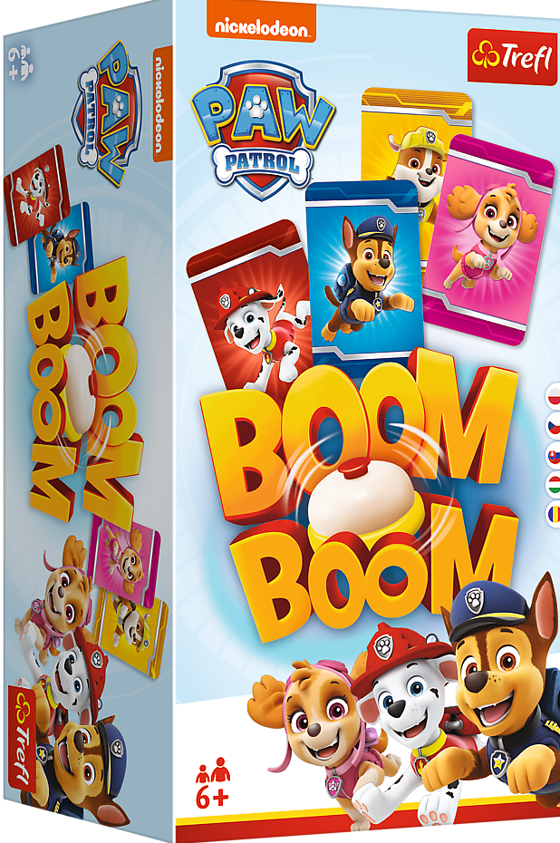 GRA PLANSZOWA. W Boom Boom gracze starają się uzbierać zestawy tych samych bohaterów bajki dla dzieci "Psi Patrol". Gracze wymieniają jednocześnie swoje karty z kartami na planszy. Po złapaniu 4 takich samych postaci gracz uderza w dzwonek i sygnalizuje zebranie gotowego stosu. Gracze mogą polować na karty tego samego typu, dzięki czemu rozgrywka jest jeszcze bardziej emocjonująca. Gracz, który zbierze wszystkie swoje zestawy bohaterów z Psiego Patrolu, zostaje zwycięzcą.