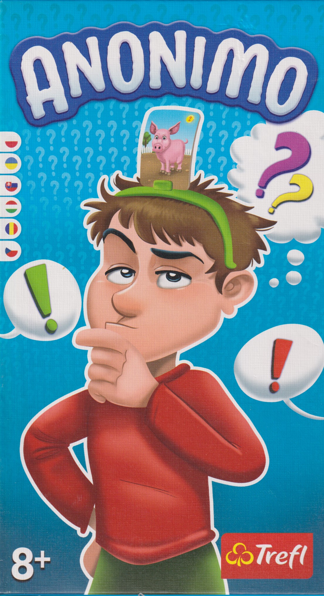 Anonimo / Mariusz Majchrowski ; illustrations Michał Ambrzykowski. - Gdynia : Trefl, [2021]. - 1 gra (56 dwustronnie ilustrowanych kart z hasłami, 4 opaski na głowę z uchwytami, strzałka i spinner do losowania podpowiedzi, 24 żetony punktów, 6 kafelków specjalnych) : karton, tektura, kolor ; w pudełku 21x21x6 cm + instrukcja ().