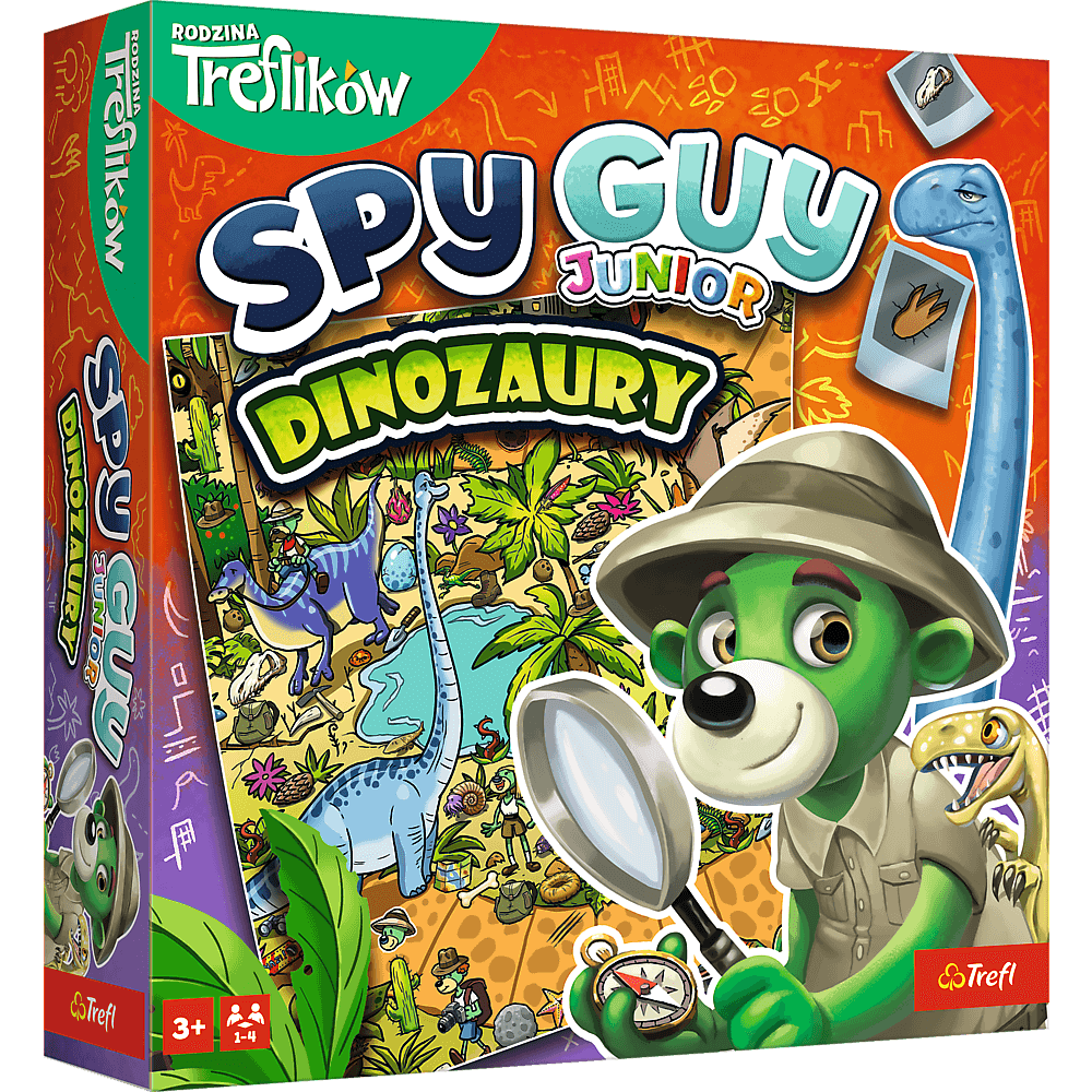 GRA PLANSZOWA. Spy Guy Junior Dinozaury to kooperacyjna gra, w której wcielacie się w rolę młodego detektywa. Spróbujcie schwytać złoczyńcę, nim ten ucieknie z parku dinozaurów z niezwykle rzadkim jajem brachiozaura. Ćwiczcie spostrzegawczość, umiejętność skupienia uwagi i współpracy, poszukując poszlak na barwnej, rysunkowej ponadmetrowej planszy. Wersja Junior dedykowana jest młodszym graczom, dlatego, aby ułatwić poszukiwania, ilustracje są większe, a plansza mniej szczegółowa.